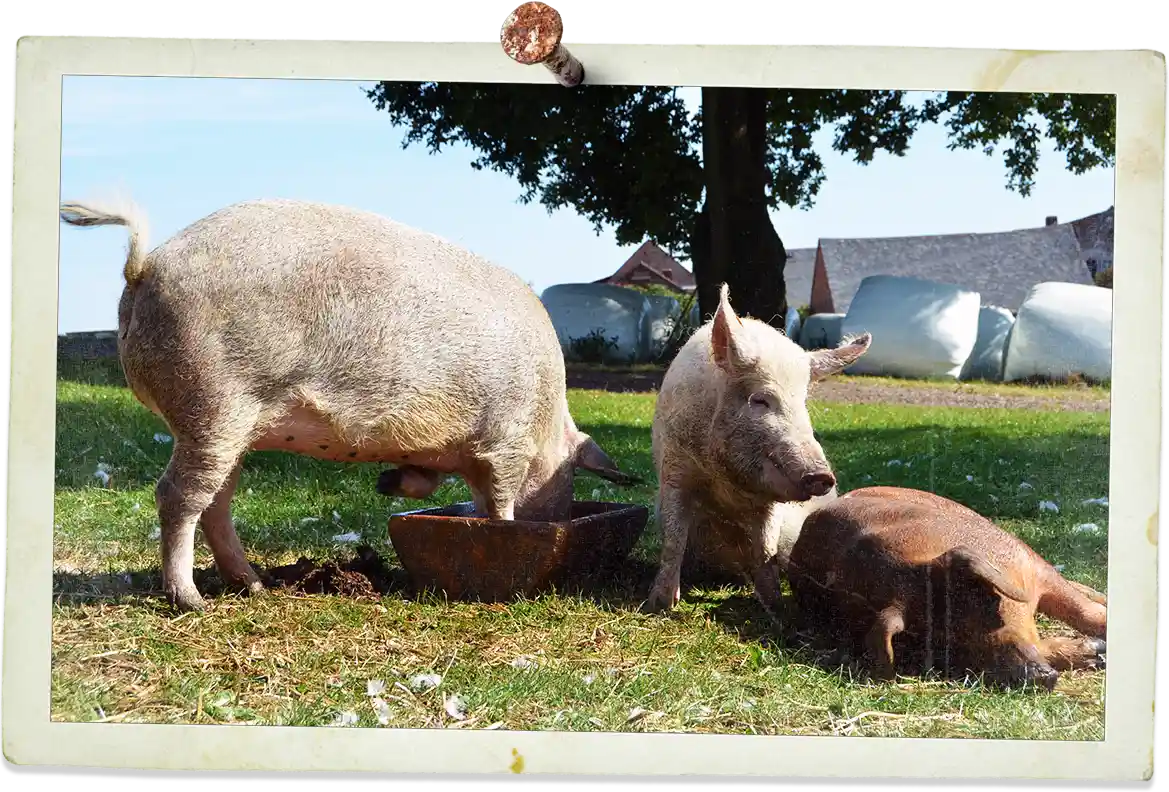 In einem hellen, lichtdurchfluteten Klimaoffenstall werden unsere Schweine auf täglich frisch eingestreutem Stroh gemästet. Natürlich bekommen unsere Tiere nur bestes und gesundes Futter. Die Tiere erhalten während der Mast ausschließlich betriebseigenes Getreide.